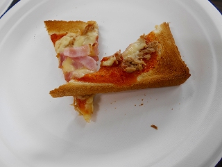 食パンに、ピザソースを塗り、ベーコン、ツナ、チーズをのせて