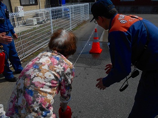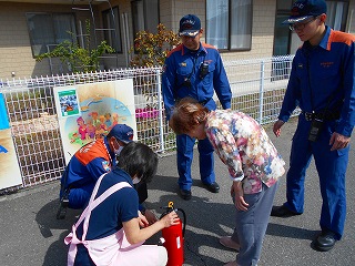 避難訓練後は入居者様も参加の消火器の使用方法の説明と水消火器の実践です!!