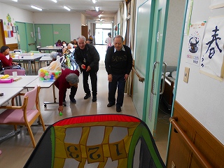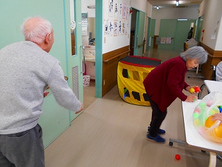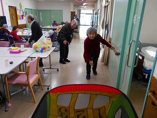 入居者様にはボールを数個持っていただき、的を狙ってボールを投げていただく☆(^o^)丿☆
