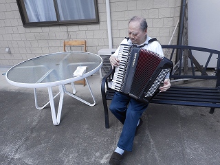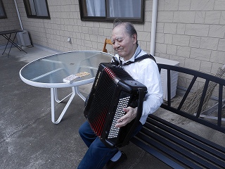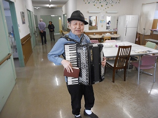 本日、入居者様から撮ってとアコーディオンを背負ってホールへ\(^o^)/