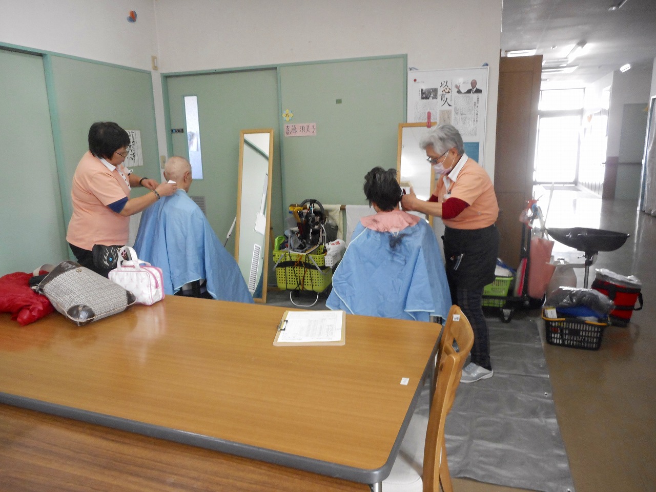 お昼を食べて少しすると美容師さんが2名大きな鏡を持ってホールでカットやお髪を染めてくれます。