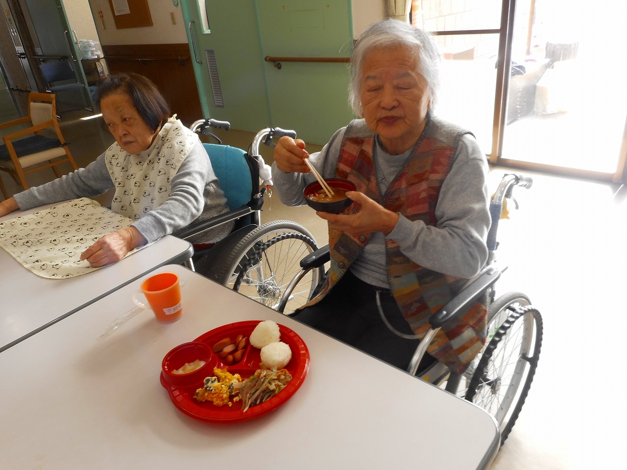 準備が出来たので、ホールで頂きました! 一番人気は、素朴な塩むすびです。けんちん汁も体が温まり大好評でした!