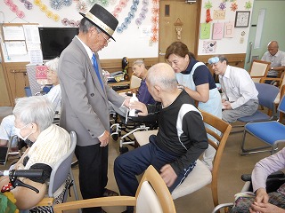 シャボン玉で一緒に遊び、施設の中では、マジシャンMr.ナカムラのマジックショーを