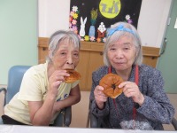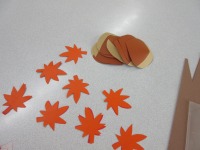 10月のホールの飾りを入居者様と一緒に作成しています。