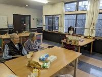 ホールで朝から過ごされている入居者様に施設長が朝の挨拶に