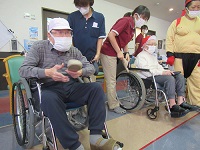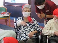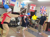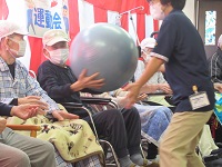 職員競技の前に入居者様に職員の頭につけた風船を5個先に割った方が勝ちゲームのデモンストレーションを