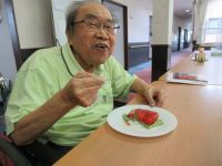 すいかをくり抜いて入れたすいかゼリーをのせています(*^^*)