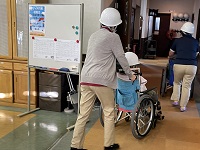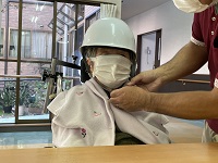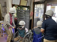続いて入居者様の避難実施。ヘルメットをかぶって頂いて、いざ避難です。
