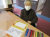 リスの塗り絵に色鉛筆をもって早速塗り始める方、どのように塗ろうか上から見たり横から見たりして悩まれている方それぞれでしたが、皆さま上手に塗って下さいました☆