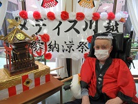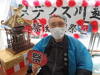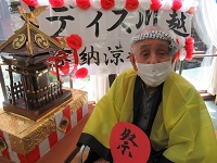 まず入居者皆様にはお神輿前に順番にお越し頂き、法被を着てねじり鉢巻きをして頂きました。