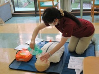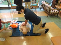 マネキンも用意してAEDの操作・心臓マッサージの練習を的確に行えるようスタッフも交代で行います。