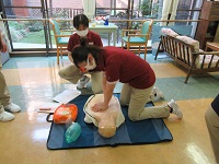 看護師が講師となって意識不明の状態の方を発見した時の対応方法を確認しました。