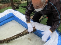 昨日行った浸水作業でたっぷり水を吸った原木を直射日光のあたらない場所へ。