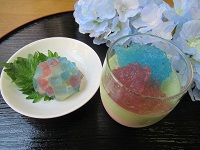 白あんを青と紫で色付けした寒天ゼリーで包み、紫陽花そのものの出来映えです( *´艸`)