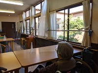 中庭から 2階の窓を掃除している姿を 入居者様も眺めて
