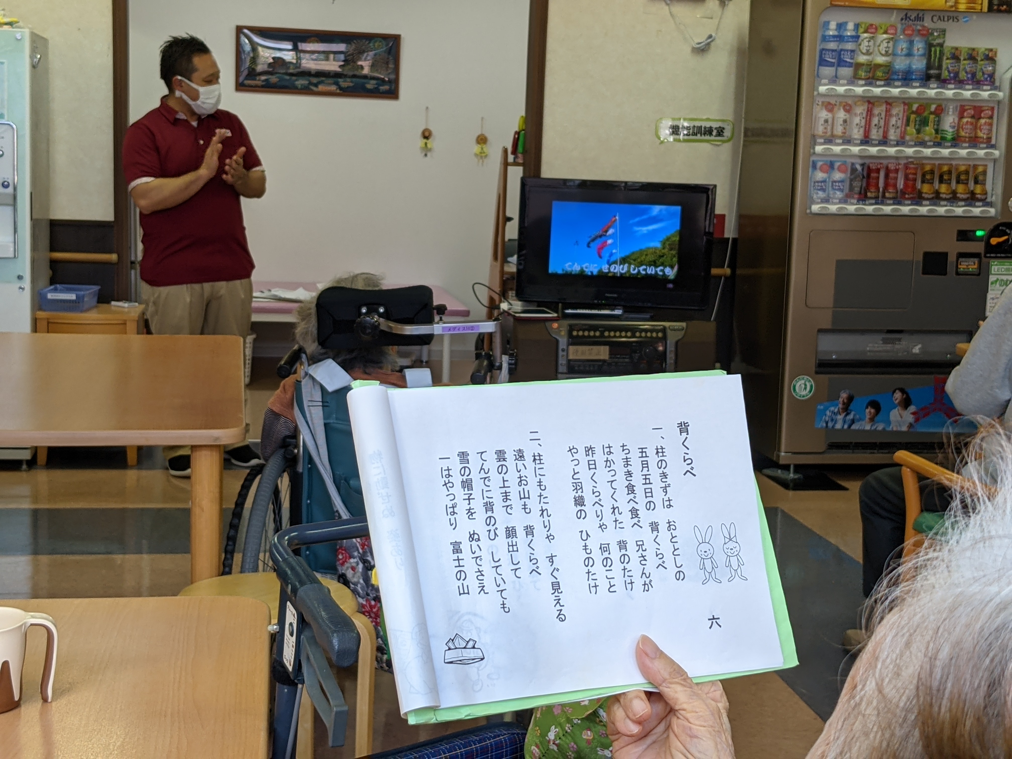 体操の後は 歌集片手に歌を歌って午後レク時間はおしまいです!