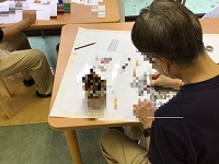 男性スタッフが大きい背中を丸めてなんだか細かい作業を