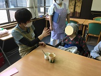 機能訓練指導員さんが、入居者様の塗り絵を並べてどう飾ろうか悩んでいる様子。