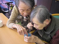 「あら、ここに金魚がいるわよ!!」とご入居者様同志楽しそうに金魚を探しています。