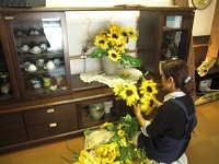 梅雨明け間近となり玄関飾りがアジサイからヒマワリへとバトンタッチしました。