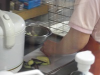 昼食の一品にと、即収穫してさっそく厨房さんの調理の始まりです。