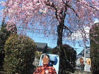 濃いピンク色の花をつけた枝垂れ桜がきれいに咲いていました。天気も晴れ!!ちょうどよい暖かさです。