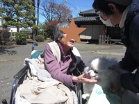 途中でかわいいわんちゃんに出会いました。抱っこさせてもらって入居者様もにっこり♪♪楽しいお散歩になったようです。