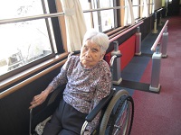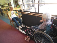 膝の曲げ伸ばしをする器具を使ってのリハビリとなりますが、入居者様の笑顔をご覧ください。