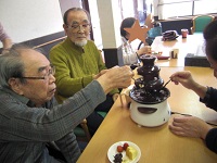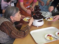 いちごやバナナなどのフルーツやバームクーヘンに『チョコレートファウンテン』からあふれ出るチョコレートをつけてパクリ♪♪