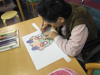 無言でお面に色を塗っています。