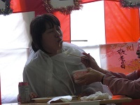 今回米寿の入居者様にも目隠しで参加して頂き、職員に食べさせてもらいました。