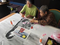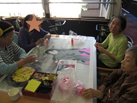 かぐや姫の貼り絵なので月があるのですが、ある入居者様は黄色の中に青やピンクをちりばめていらっしゃいました。理由をお聞きすると「月が黄色って誰が決めたの??」と。