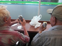 「一杯やってく?」ということで中のイートインコーナーで焼鳥とビールで乾杯です。
