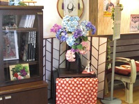 サイドボードの中の紫陽花の色彩が目を引きます。