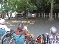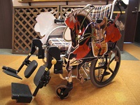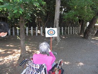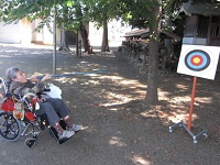 車椅子を馬に見立てて流鏑馬風に吹き矢で矢を放ちます。