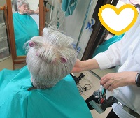 ホールでカットの終わった入居者様にはスタッフが「さっぱりしたね~」「可愛くなりました」など