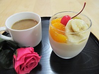 特別おやつは「牛乳プリンと黒蜜プリン」2色のプリンアラモードを召し上がって頂きました(*’▽’)