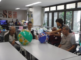 今日はおやつ後にみなさんで1Fホールに集まりボール回しを