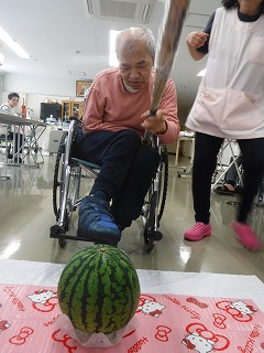 みなさんスイカを割るのに真剣になってバットを振り下ろすも