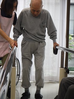 今日は平行棒にて入居者様を集めて歩行練習を行っています。