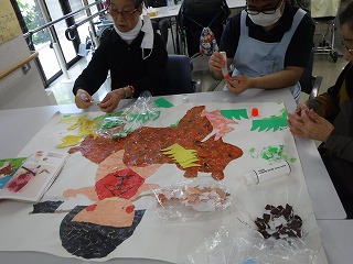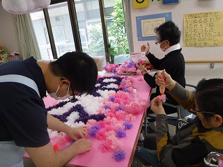今日も利用者様と協力して令和飾りの完成に向けて頑張っています!