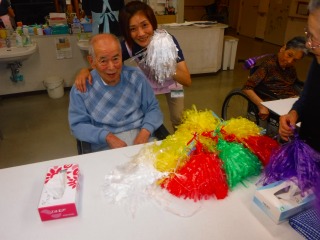 今日はサンリオコーナーに設置予定の小物を入居者様と一緒に制作しています。