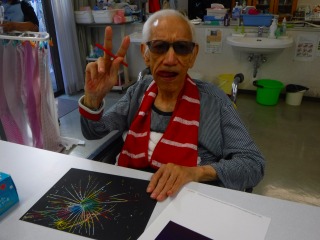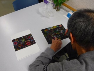 今日はレインボーペーパーシートを使って花火の絵を書いていただきました。