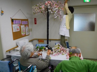 今日は入居者様2人と桜の飾りつけのお手伝いして