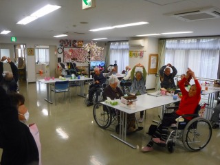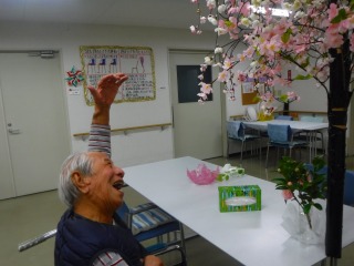 今日は桜の木と一緒にリハビリ体操を行っています!