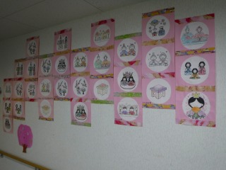 入居者様とスタッフでひな祭りの絵にぬり絵した作品を