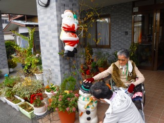 今日はクリスマスに向けて玄関前の飾りつけを入居者様と一緒に行いました♪