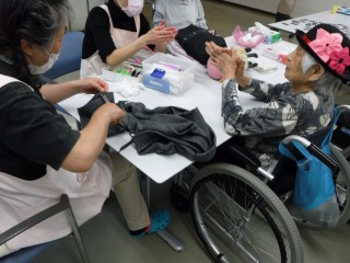 今日はみなさんのほつれた衣服などをを介護さんが直してくれてます!