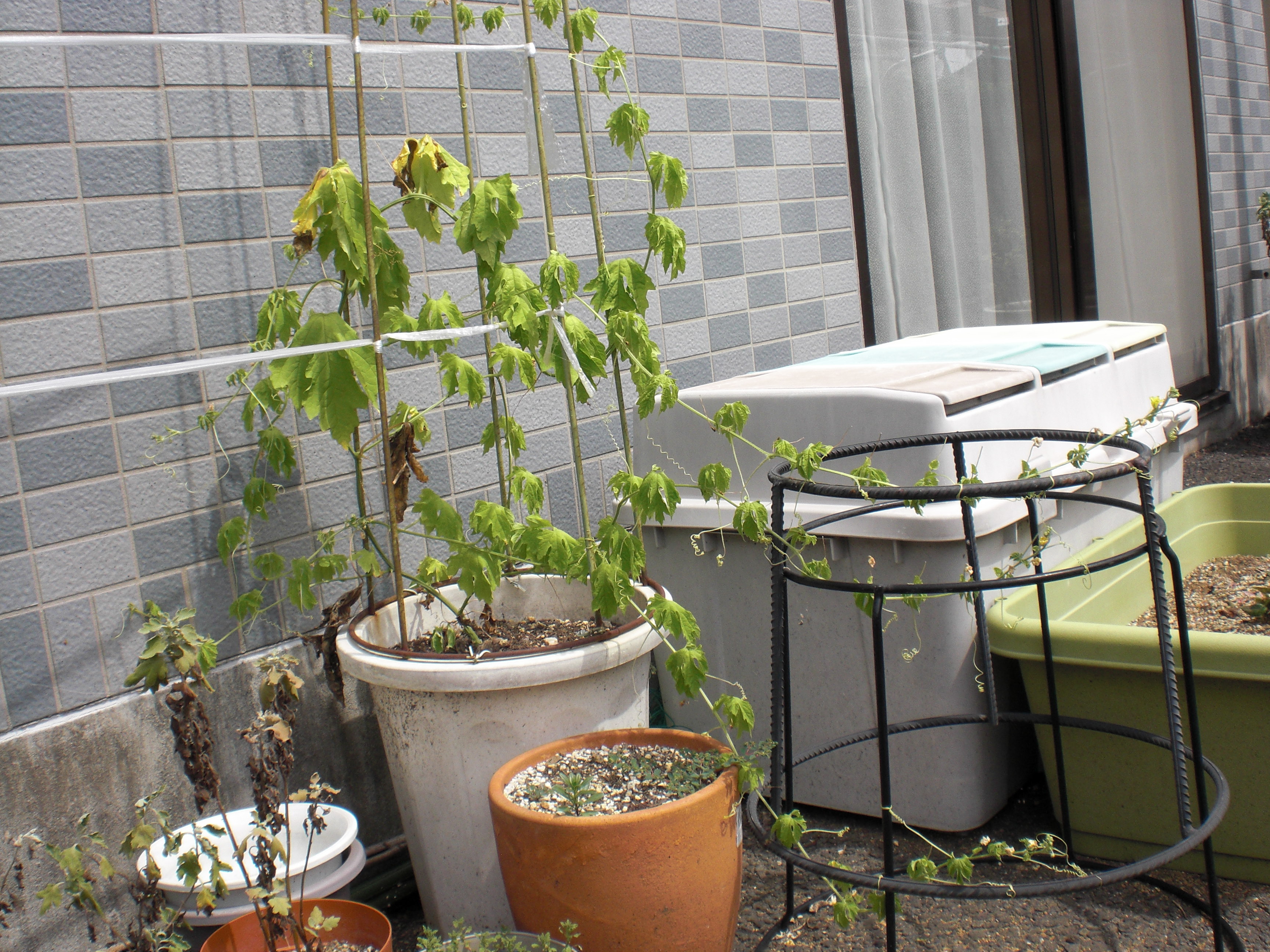ゴーヤの苗は、少し日に焼けた感じで、上部の方が枯れ始めてしまいました。