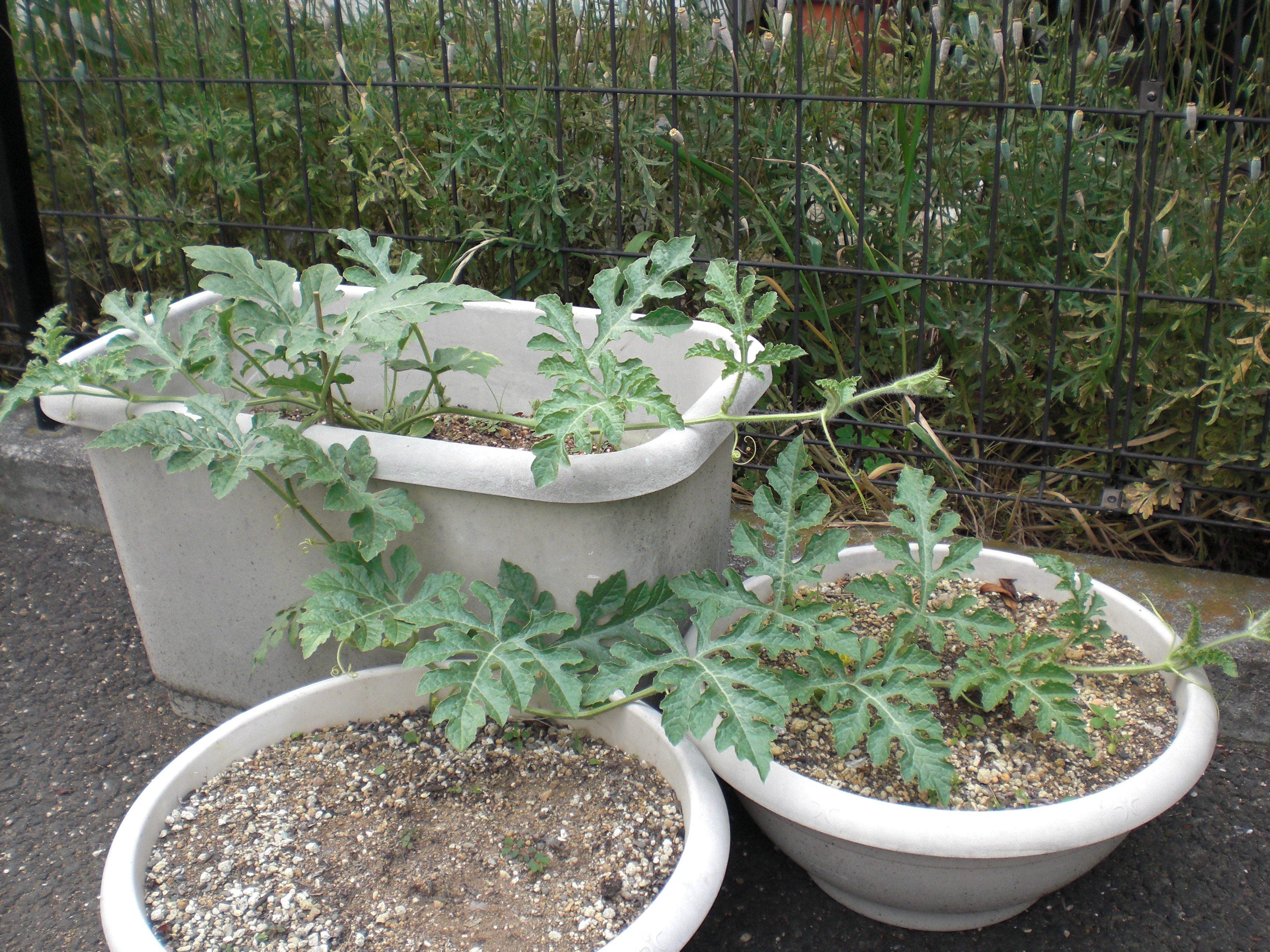 すいかの苗がだいぶ成長をして、花もいくつか咲いていました。
